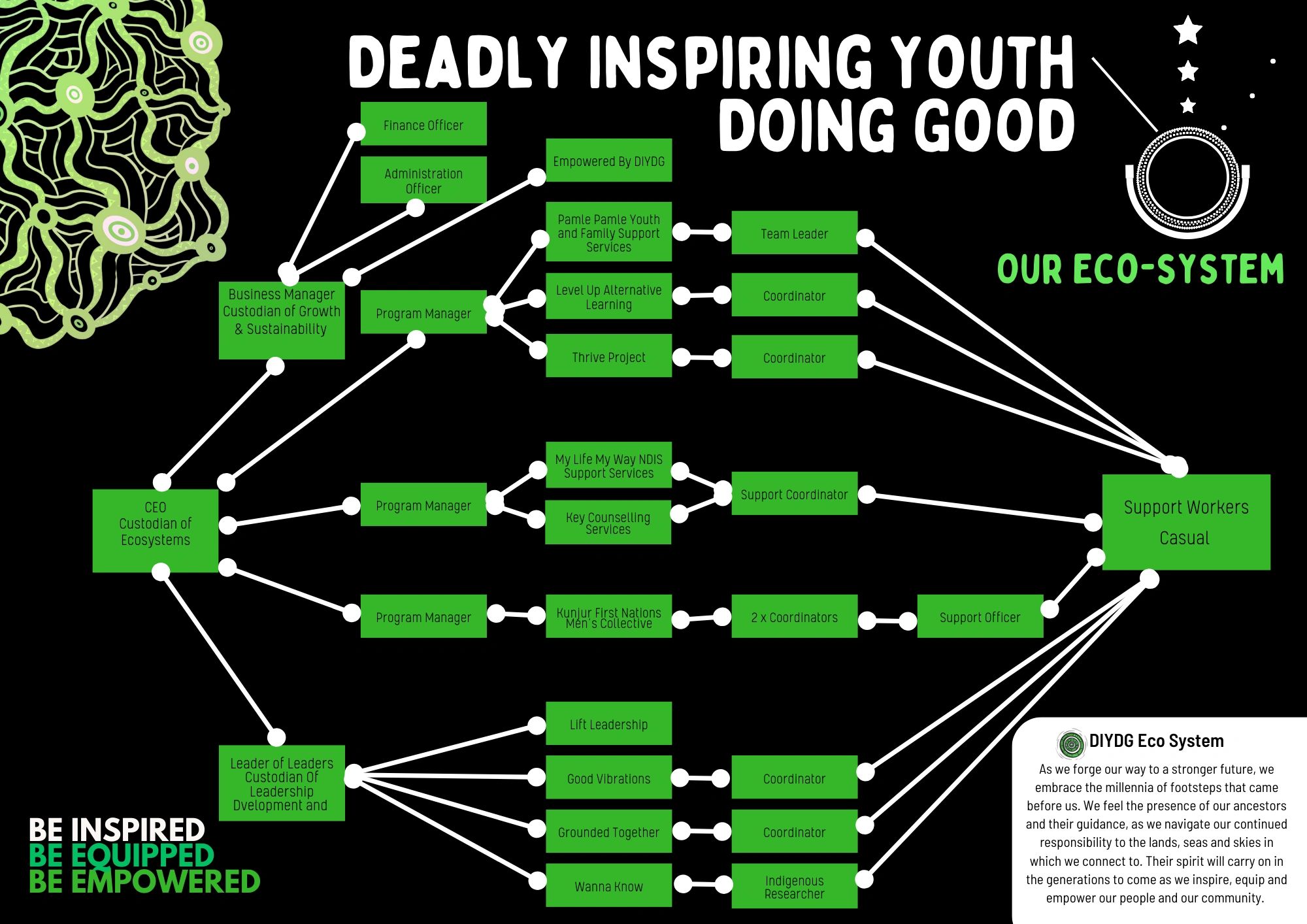 At Deadly Inspiring Youth Doing Good (DIYDG), our ecosystem is much like a strong and enduring tree deeply rooted in Country and community. Every aspect of our work is interconnected, with each element playing a vital role in nurturing, growing, and sustaining our mission to empower young people and families.