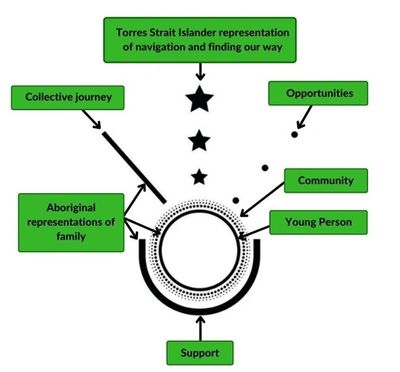 Another aspect of this design is the stars showcasing the Torres Strait Islander cultures incorporated and represented in DIYDG. These are to show the star on the Torres Strait Islander flag and the navigation through the challenges DIYDG has overcome to finding our way in growing our organization. Next to the stars are the dots leading outwards to represent the opportunities both the organization and young people have available to undertake as part of their journey.